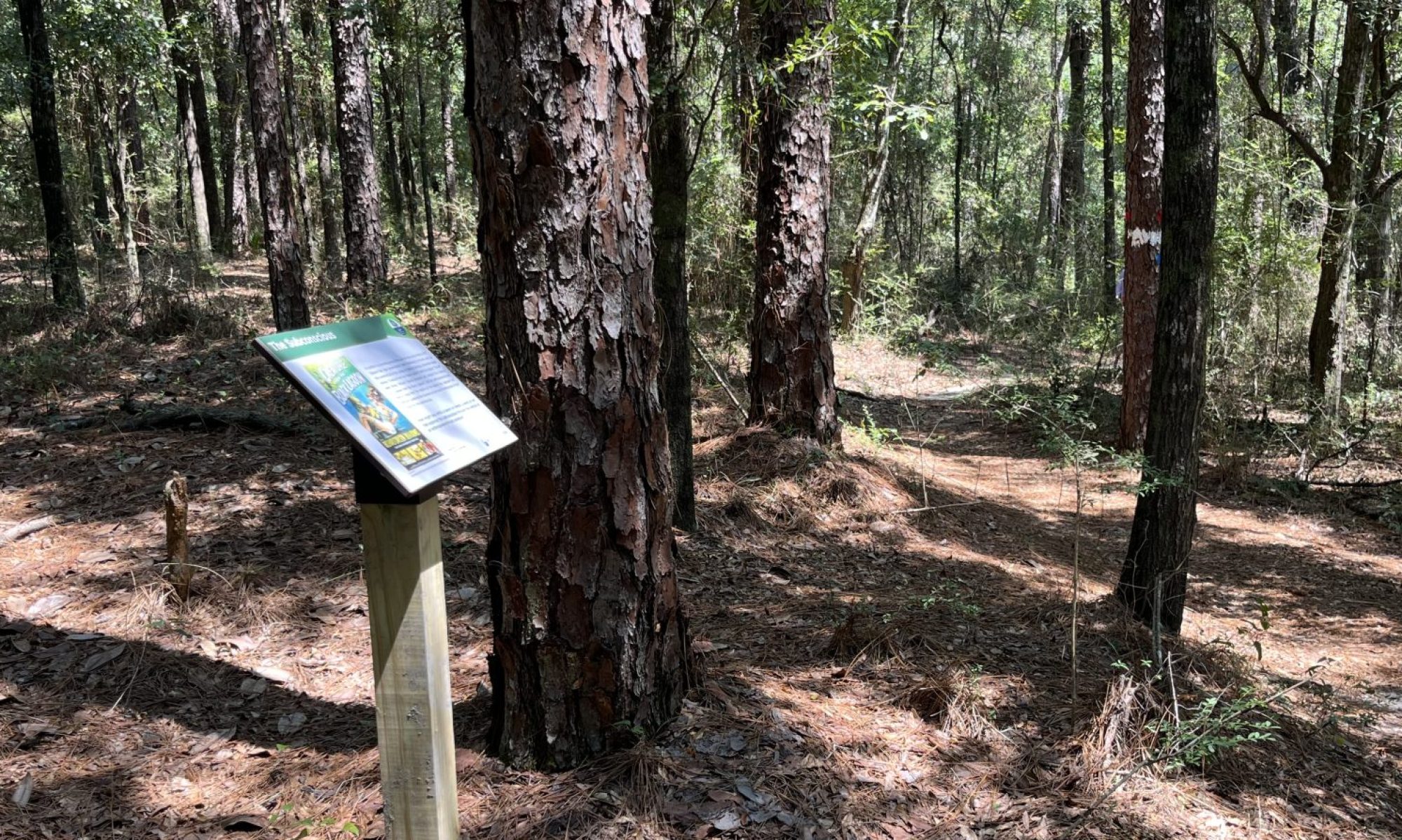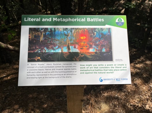 The UWF Poetry and Art Nature Trail features work from national, regional, historical, and contemporary artists and poets including Mary Ann Carroll, Robert Frost, Langston Hughes, John Markowitz, Mary Oliver, Milicent Patrick, Charlotte Pence, Alexis Rockman, Lyda Toy, and William Butler Yeats.